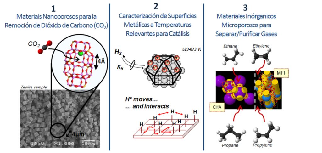 Muchos de los materiales adsorbentes poseen una estructura porosa compleja compuesta de poros de diferentes tamaños y formas. Se habla de ancho de poro cuando los poros tienen forma de láminas y de diámetro de poro cuando los poros tienen forma de cilindros. Según la Unión Internacional de Química Pura y Aplicada (IUPAC por sus siglas en inglés). La porosidad se puede clasificar en tres grupos, los microporos con un ancho no superior a 2 ηm, los mesoporos con un ancho de 2 a 50 ηm y los macroporos que tienen un ancho mayor a 50 ηm. La importancia de los poros en los procesos de adsorción está ligada a su tamaño, permitiendo la exclusión de unas moléculas y no de otras. Los materiales adsorbentes pueden ser diseñados con distribuciones de tamaño de poro precisas para una separación particular de gases, dando lugar a una amplia variedad de materiales nanoestructurados, tales como zeolitas y tamices moleculares a base de carbono. El tamaño de los microporos determina la accesibilidad de las moléculas de adsorbato a la superficie de adsorción interna, por lo que la distribución de tamaño de poro de los microporos es una propiedad importante, de igual forma el proceso de llenado de los poros en el que su volumen es el factor de control principal. Siendo el volumen de los microporos otro parámetro esencial en la caracterización de estos materiales, por lo general este se refiere a una unidad de masa y está relacionado a su tamaño característico. Otra característica importante de un proceso de adsorción es la fuerza del proceso de adsorción o entalpia de adsorción. La adsorción que resulta de las interacciones de Van der Waals, se llama adsorción física o fisisorción, las moléculas adsorbidas físicamente en la superficie de un material pueden ser removidas con facilidad mediante el aumento de la temperatura o la reducción de la presión del sistema, por lo tanto, es un proceso reversible. La adsorción química o quimisorción, en contraste con la adsorción física, se produce sólo como una monocapa y por lo general a temperaturas más altas; es un proceso específico que puede tener lugar en algunas superficies sólidas para un gas en específico. De manera esquemática la investigación realizada se puede dividir en tres categorías, como se muestra en la Figura 2 y se describe en el artículo adjunto. Esto incluye la investigación realizada durante el Doctorado en Ingeniería Química (2007-2011), el trabajo de investigación durante el postdoctorado en Berkeley (2012-2013), así como parte del trabajo exploratorio de Berkeley y que continúa la autora realizando actualmente en Praxair, Inc.