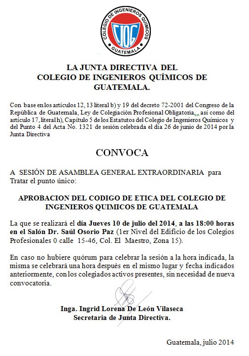 1. Se recomienda que las autoridades del Colegio de Ingenieros Químicos de Guatemala -CIQG- (Asamblea General, Junta Directiva y Tribunal de Honor), en conjunto con las de otros colegios profesionales soliciten al Congreso de la República de Guatemala, a través de la Asamblea de Presidentes de los Colegios Profesionales, la modificación del Decreto 72-2001 (Ley de Colegiación Profesional Obligatoria) en lo que corresponde a los aspectos relacionados con la autorización legal del ejercicio profesional, puesto que se considera que las modalidades de entrega académica en las universidades del país, dan lugar a dudas sobre su contenido curricular y por consiguiente a la calidad académica de las carreras universitarias en general.