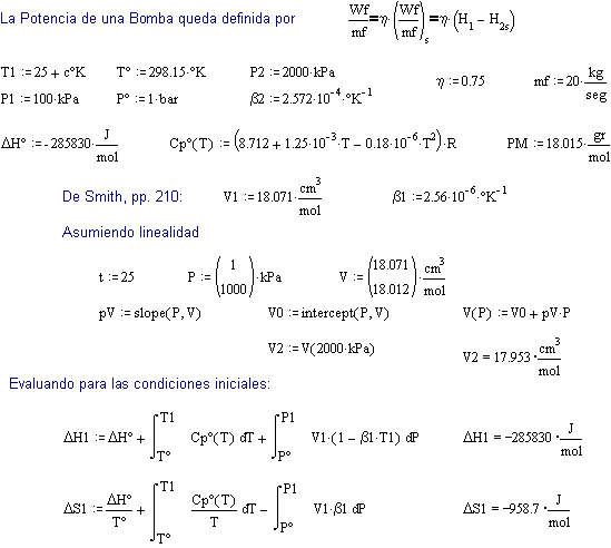 Una bomba funciona adiabáticamente con agua líquida. Las condiciones de entrada son 25°C y 100 kPa y una rapidez de flujo de masa de 20 kg/seg. La presión de descarga es 2000 kPa y la Eficiencia de la Bomba de 0.75.