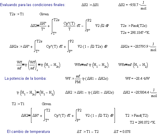 Determinar la potencia de la bomba y la temperatura del agua descargada, sabiendo que el coeficiente de compresibilidad volumétrica del agua a esas condiciones es 257.2 x 10-6 °K-1.