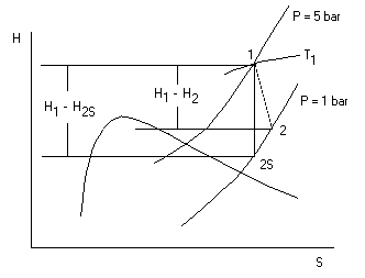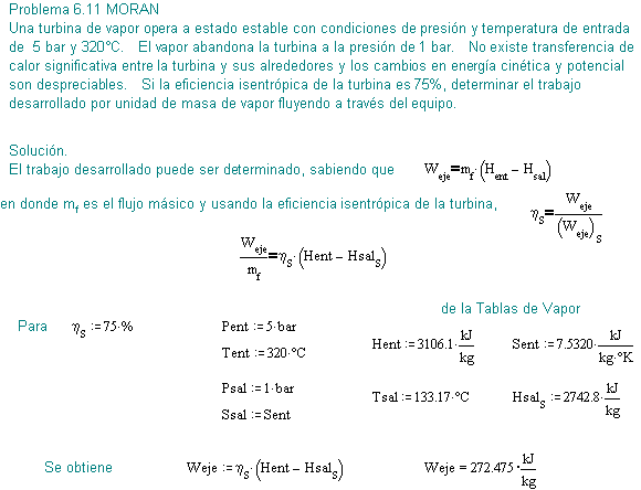 Para una turbina, el trabajo desarrollado por unidad de masa fluyendo se determina a partir de la eficiencia isentrópica y del trabajo isentrópico desarrollado.